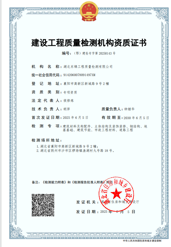 閱讀次數(shù):220 發(fā)布時間:2025年06月11日2025年6月5日,湖北東錦工程質(zhì)量檢測有限公司順利拿到建設(shè)工程質(zhì)量檢測機構(gòu)資質(zhì)。標志著東錦公司的技術(shù)實力與質(zhì)量管理體系獲得權(quán)威認可,同時也為區(qū)域建設(shè)工程質(zhì)量提供更強保障。
